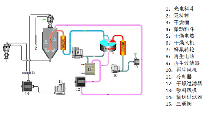 –、干燥除湿部分:从干燥料桶回来的湿热空气经冷却,吹入蜂巢转轮.空气中的水分被转轮吸附,然后又被再生加热空气所脱附.两股气流同时作用在转轮上,并随着转轮的转动,使得空气中的水分连续不断的被吸附又被再生空气所脱附而排出,就形成稳定的低露点空气,经加热到塑胶的干燥温度,吹入干燥料桶内,形成密循环,干燥原料.
