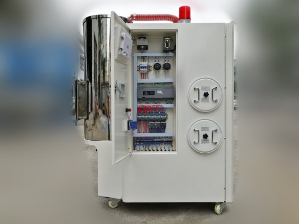 –、吸料部分:吸料是从储料桶或其它储料容器中吸入干燥料桶内,当真空料斗的磁簧开关侦测到无料时,吸料马达运转,使真空料斗内产生真空,储料桶中的原料由于空气的压力差被吸入真空斗内,当吸料时间完成后,吸料马达停止运转,原料会因自重落入干燥料桶内.经干燥后的原料从干燥料桶抽到安装在成型机的光电料斗或微动料斗内.