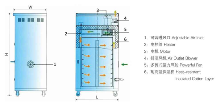 1. 精密P. I. D. 电子温控器,使烘干郊果均匀;